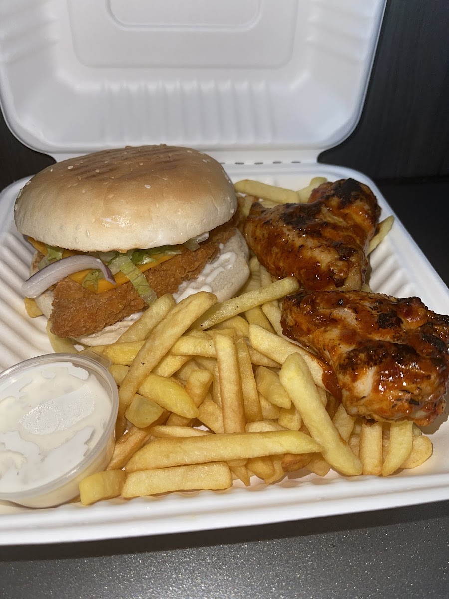 Floured bap with a 4oz grilled beef patties, a slice of melted cheese, served with a choice of your own salads and sauce.